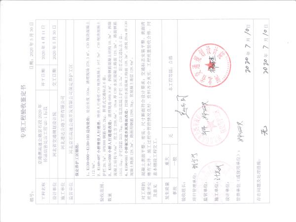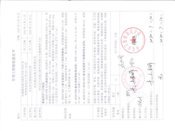 京港澳高速公路京石段2020年橋涵病害處治工程QH-1標(biāo)段驗(yàn)收證書