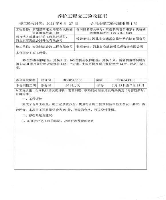 京港澳高速公路京石段橋涵病害維修處治工程驗(yàn)收證書