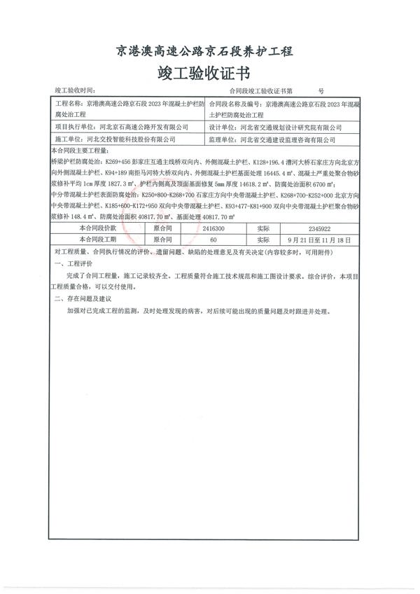 京港澳高速公路京石段2023年混凝土護(hù)欄防腐處治工程驗(yàn)收證書