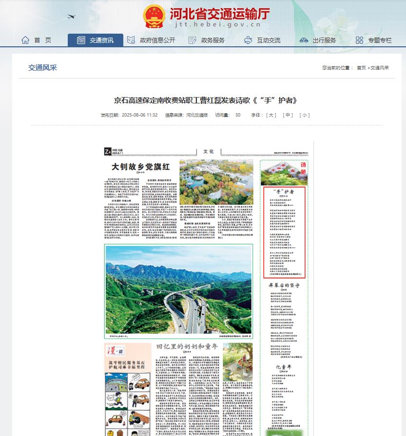 《河北省交通運(yùn)輸廳》京石高速保定南收費(fèi)站職工曹紅磊發(fā)表詩歌《“手”護(hù)者》
