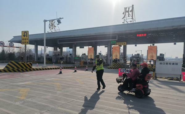 當(dāng)日交通流量平緩,收費站工作人員正常工作時,突然發(fā)現(xiàn)一輛電動三輪車正朝著高速主干道緩緩行駛,車上兩位老人神色茫然、行駛遲疑。由于高速公路嚴禁非機動車駛?cè)耄ぷ魅藛T當(dāng)即判斷存在極大安全風(fēng)險,迅速上前示意后方車輛減速避讓,同時引導(dǎo)老人將車??恐涟踩珔^(qū)域。