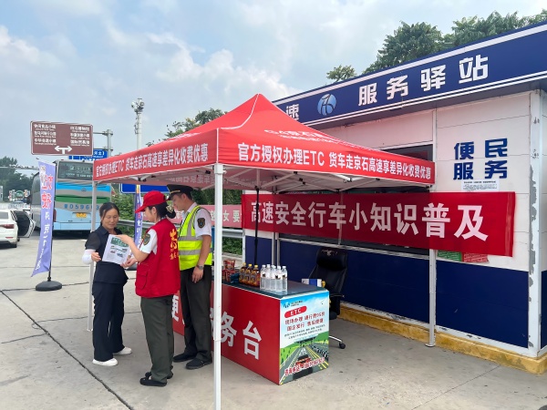 活動現(xiàn)場,定興站工作人員在站口設(shè)置了醒目且溫馨的宣傳臺和咨詢點。在炎熱的夏季為過往的司乘人員準(zhǔn)備了礦泉水、濕巾等防暑用品??紤]到夏季高溫天氣對高速行車的影響,工作人員著重開展了夏季高速安全行車小知識普及活動。從車輛輪胎的保養(yǎng)、發(fā)動機的散熱,到高溫天氣下駕駛員的疲勞預(yù)防等方面耐心細致地為司乘人員講解,提醒他們注意夏季行車的安全隱患。