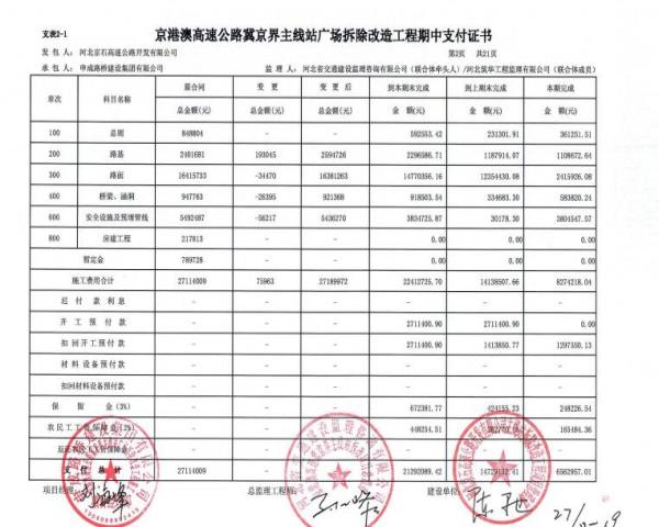 京港澳高速公路冀京界主線站廣場拆除改造工程期中支付證書