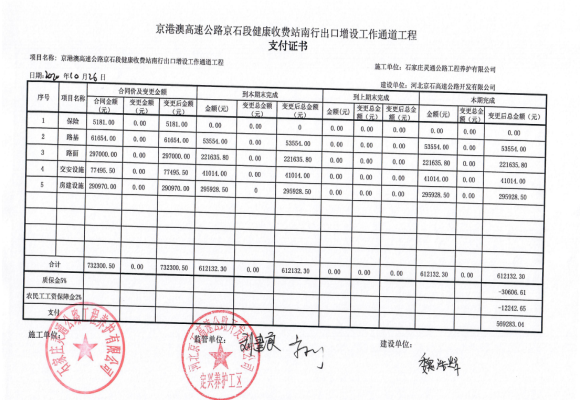 京港澳高速公路京石段健康城收費站南行出口增設(shè)工作通道工程支付證書