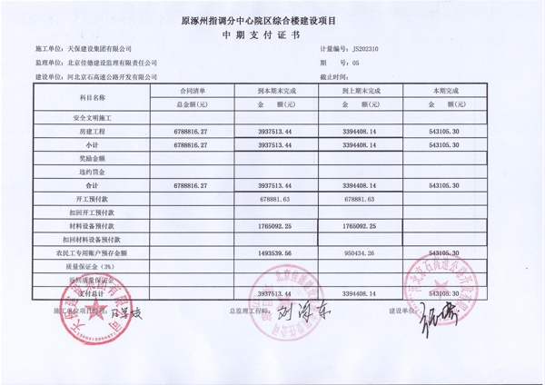 原涿州指調(diào)分中心院區(qū)綜合樓建設(shè)項(xiàng)目第五期中期支付證書
