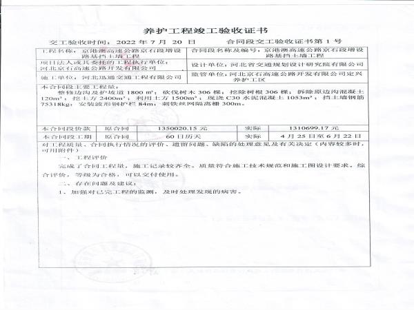 京港澳高速公路京石段增設(shè)路基擋土墻工程驗(yàn)收證書
