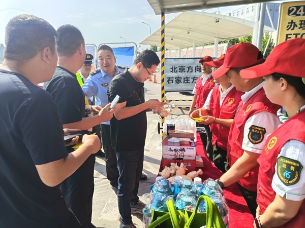 座談會后,雙方黨支部的黨員志愿者共同前往徐水收費站外廣場,設(shè)立“雙節(jié)便民服務(wù)站”,以志愿服務(wù)踐行初心使命。黨員們佩戴黨徽、亮明身份,分工協(xié)作開展服務(wù):