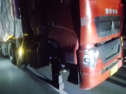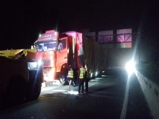 經(jīng)詢問司機得知,貨車右前輪突然掉落,導致車輛無法移動。事發(fā)突然,且處于夜間,大風呼嘯,情況十分危險。定州工區(qū)工作人員立即反應,第一時間在貨車后方規(guī)范設(shè)置交通警示標志,巡查車開啟導向標、高音警報器,避免過往車輛發(fā)生碰撞事故,引導車上人員轉(zhuǎn)移至護欄外安全地帶。同時,迅速撥打高速交警與救援電話,通報現(xiàn)場情況。智調(diào)中心及時利用可變情報板對后方來車予以提醒,避免造成事故。