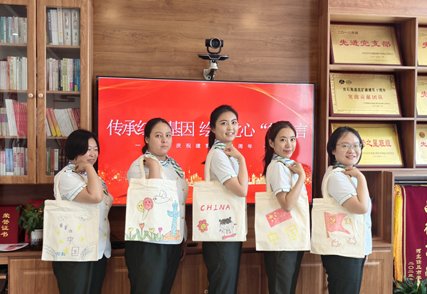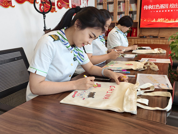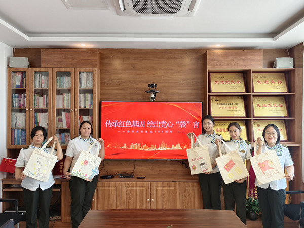 活動中,員工們互幫互助、共同進步。繪畫技藝嫻熟的員工主動分享繪畫技巧,耐心地指導不太熟練的同事,幫助他們完善作品。在這種相互學習、相互借鑒的良好氛圍中,原本樸素無華的帆布包逐漸變得色彩斑斕、獨具特色。每一個帆布包都像是一個小小的紅色載體,承載著員工們對黨的深厚情感和美好祝愿。