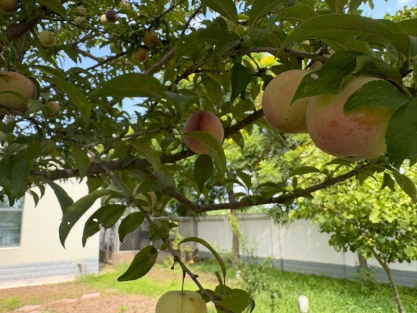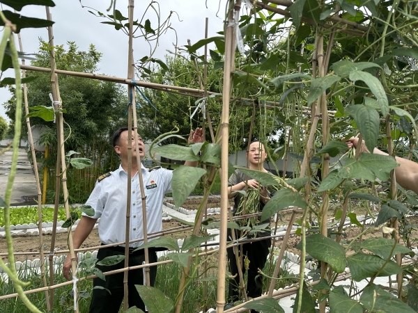 走進果蔬園,幾棵李子樹枝繁葉茂,紫紅、翠綠的果子掛滿枝頭,飽滿得壓彎了枝條,微風拂過,果香陣陣。站里的員工們趁著休息時間,小心翼翼地采摘成熟的李子,酸甜的滋味引得大家忍不住先嘗上幾顆。旁邊的菜園里更是生機盎然,長長的菜豆角像綠色的簾子掛滿竹架,飽滿挺直,隨手摘下一把,便能感受到那份帶著泥土氣息的新鮮。